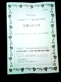 2010.09.05 こちら在宅福祉部です! 医療知識を持つケアマネジャーの養成です。 去年から出来た在宅医療サポートケアマネジャー研修。 医療系出身以外のケアマネジャーを対象とした研修です。 修了するには2か月にわたって9日間の研修を受講しなくてはならないとのこと・・・ 本年度は私が行って勉強して実践で皆様のお役にたてるように頑張ってきます! Writer:中井 紫鶴