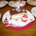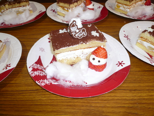 可愛いいイチゴのサンタと桃と生クリームの入ったケーキをお出しし