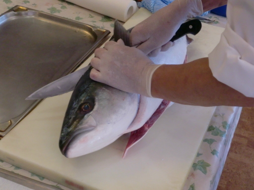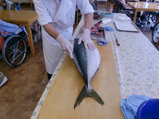 > 司会は奥本ヘルパー長が担当し、厨房の安藤さんが2匹さばいて下さいました。