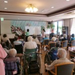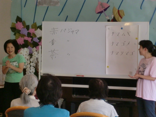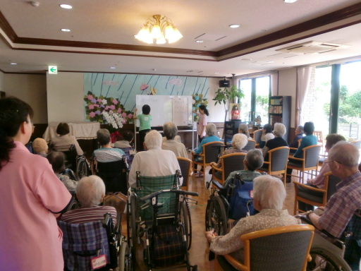2013.07.02 シルバービレッジ日野 『♪ナマムギ ナマゴメ ナマタマゴ♪』 本日午後のレクレーションは、月一回のキラキラ体操! 早口言葉や身体のストレッチ、季節の歌を歌い、大勢の入居者の皆様が参加されました。 私も早口言葉を一緒にやってみましたが、スピードが上がるにつれカミカミになってしまいました(-_-;) 入居者の皆様も、とっても楽しまれていました。 先生のお二人の笑顔がキラキラして眩しかったです☆ 来月の体操も楽しみです(^-^) Writer: 青木みゆき