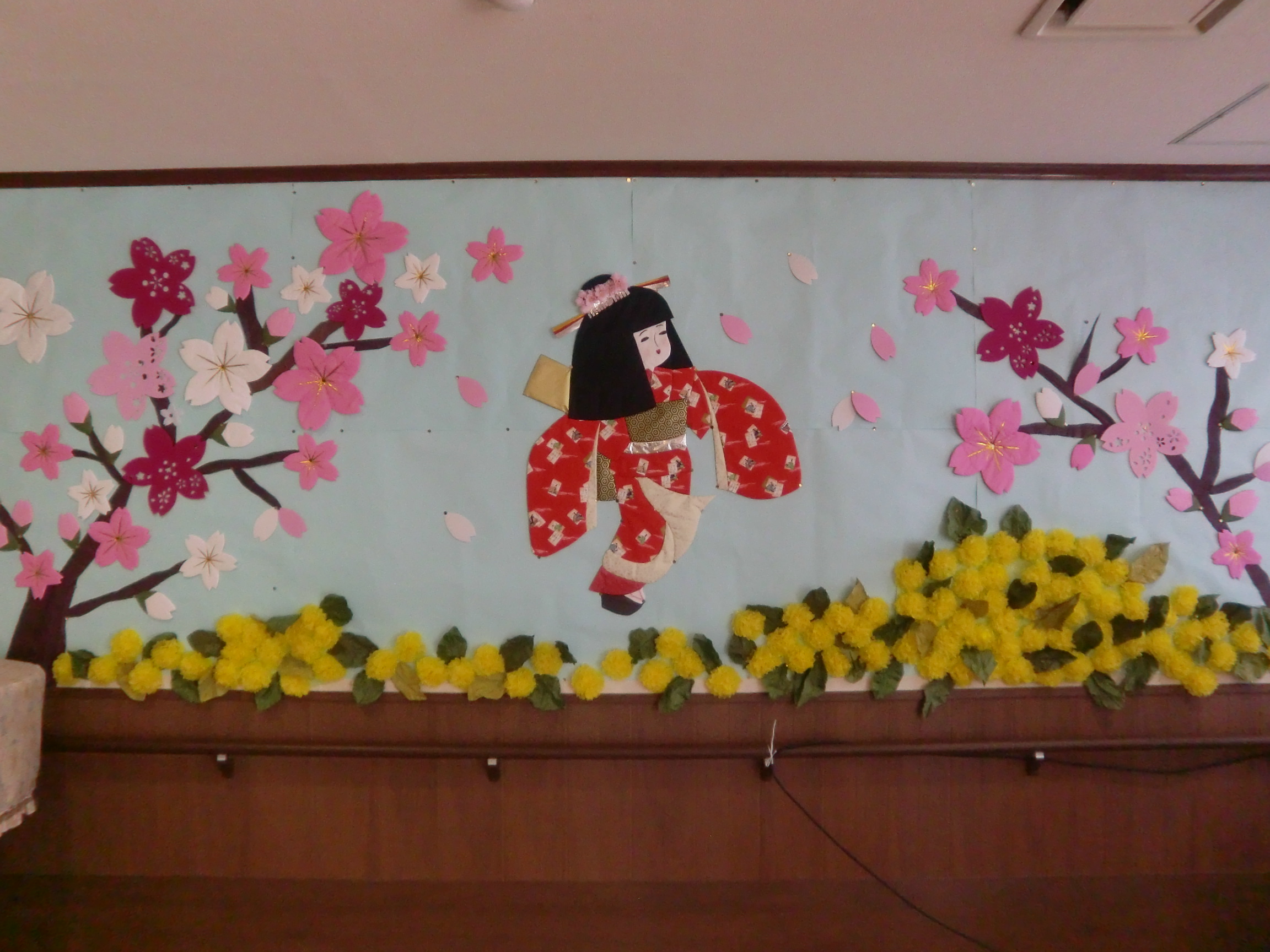 2014.03.31 シルバービレッジ日野 「日野の壁画は春爛漫♪」 「日野の壁画は春爛漫♪」 只今、シルバービレッジ日野では可愛い女の子が桜を楽しんでおります。 この可愛い可愛い女の子は、私がモデル・・・!? 作品を作った職員&入居者様が素敵なお世辞を言って下さいました。(●^o^●) 日野のホールは、春満開を迎えております。 writer:花野 亜紗子
