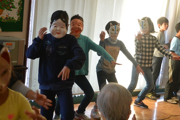 ホールをひょっとこや天狗のお面を付けた子供達が踊り歩き、皆さん、楽しまれておりました(^_^)