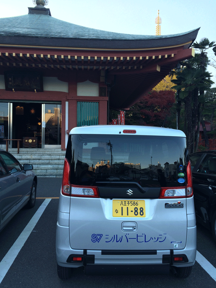 2015.12.11 シルバービレッジ日野 新たな仲間「スペーシア」 新規車両の納車です。 本日、日野の施設に車椅子の方に対応できる、小型車スペーシアが仲間入りです。 高幡不動尊において。安全運転の祈祷も済みましたので正式に運用ですね。 室内の広い軽車両にビックリです!! writer 八王子西施設長 田中 昇