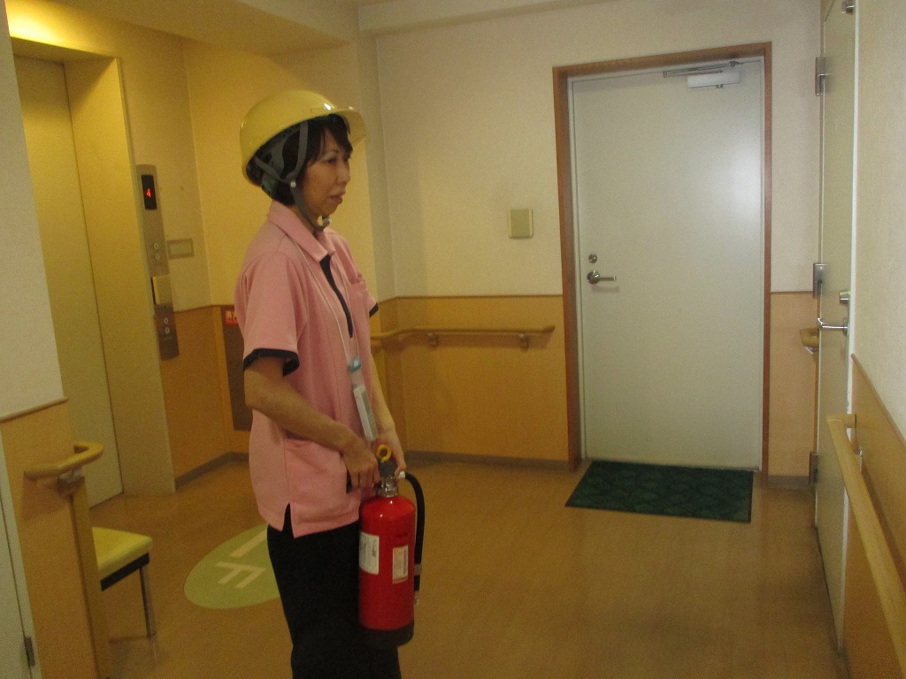 今回は夜勤時の火災発生を想定して2人1組で行いました。