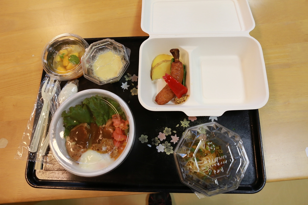 夕食のメニューでは、ロコモコ丼、グリル野菜、骨付きウインナー、