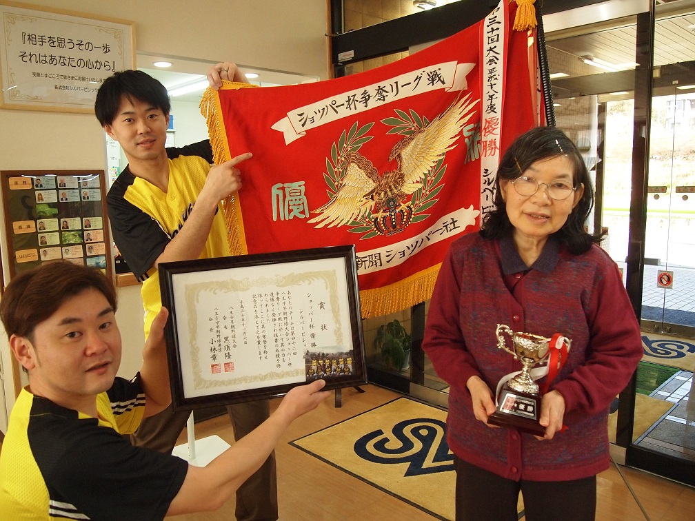こんにちは、介護部の井上です。今回の一枚は、昨年、八王子早朝野球連盟、後期ショッパー杯の優勝旗の写真です。向かって右から、八王子西の野球部応援団長の天野様。野球部部員、介護部青木さん。私です。応援団長も満面の笑みですね!開会式が4月3日に終わり、優勝旗jは返還されましたが、今年もまた持ち帰ることを団長に誓いました。4月17日より本年度の公式戦が開始されます。詳しい情報や、試合結果は、当ブログのシルバービレッジ野球部ニュース!をご覧ください。