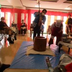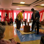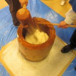 前日からお水に浸して頂いたもち米を30kg、1階テラスでせいろを使って蒸かし杵と臼でお餅をつきました。