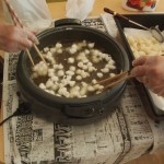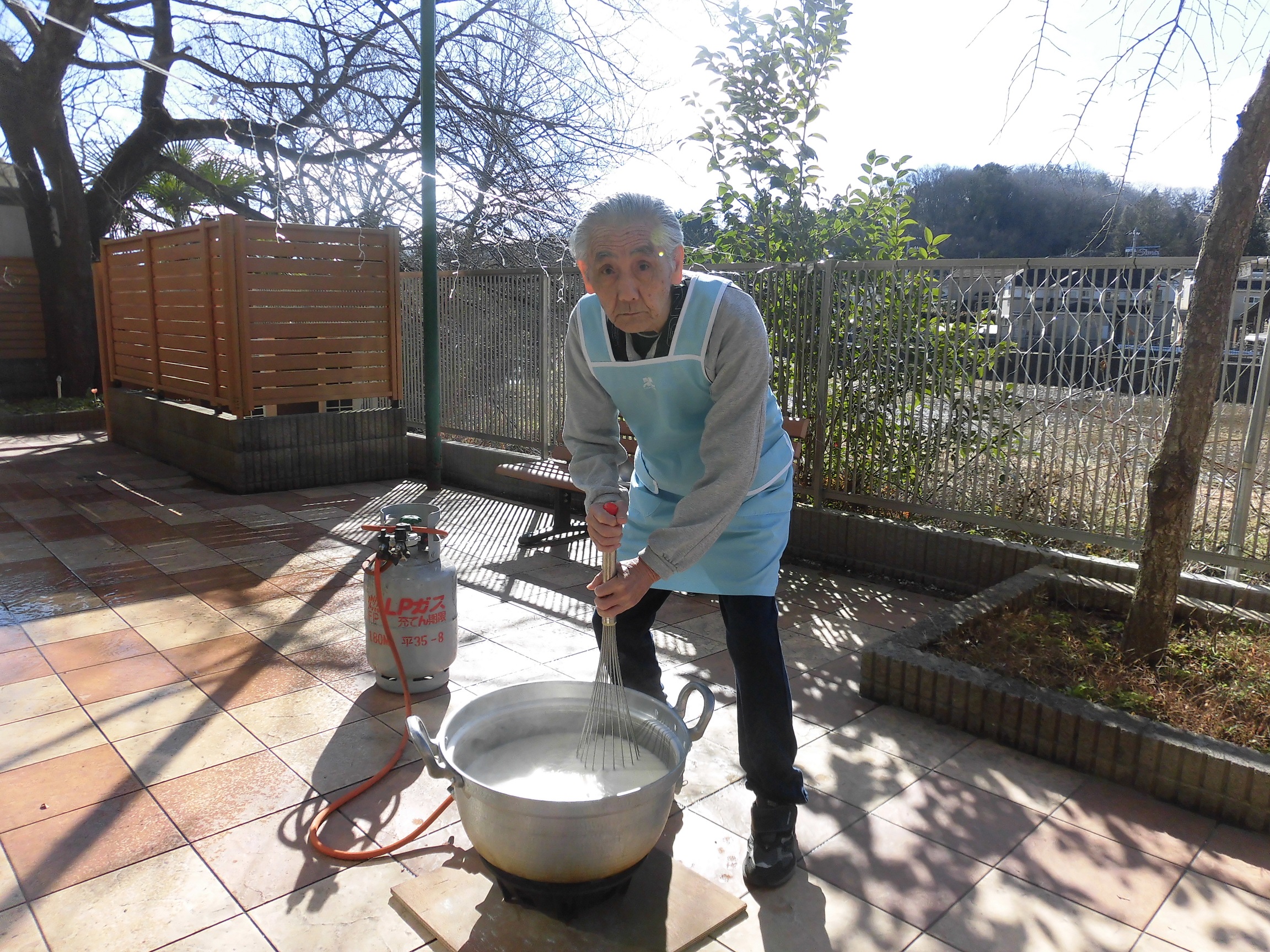 テラスで温かい甘酒作り、大きな鍋で作る甘酒は季節の風物としては欠かせませんね。