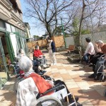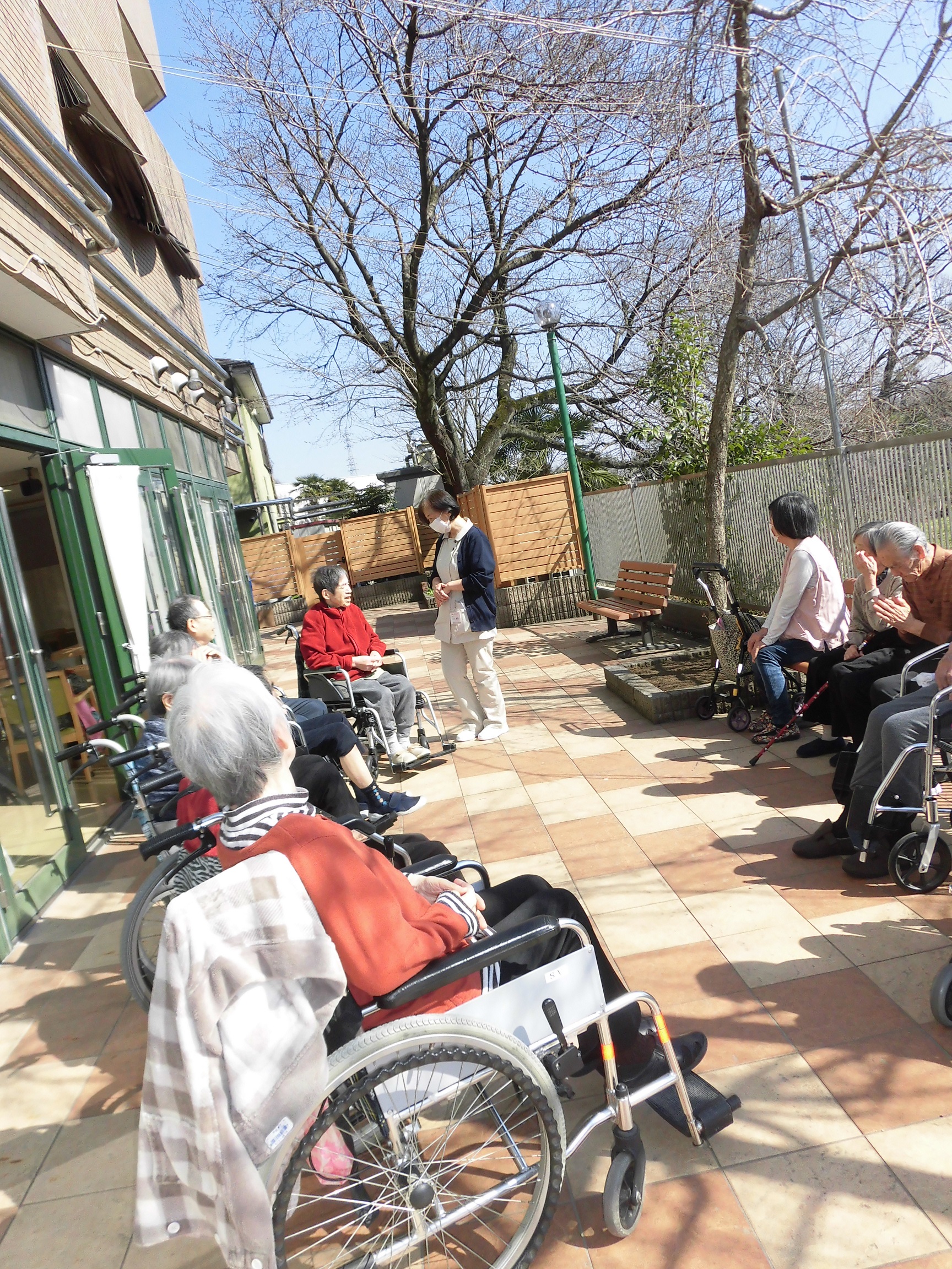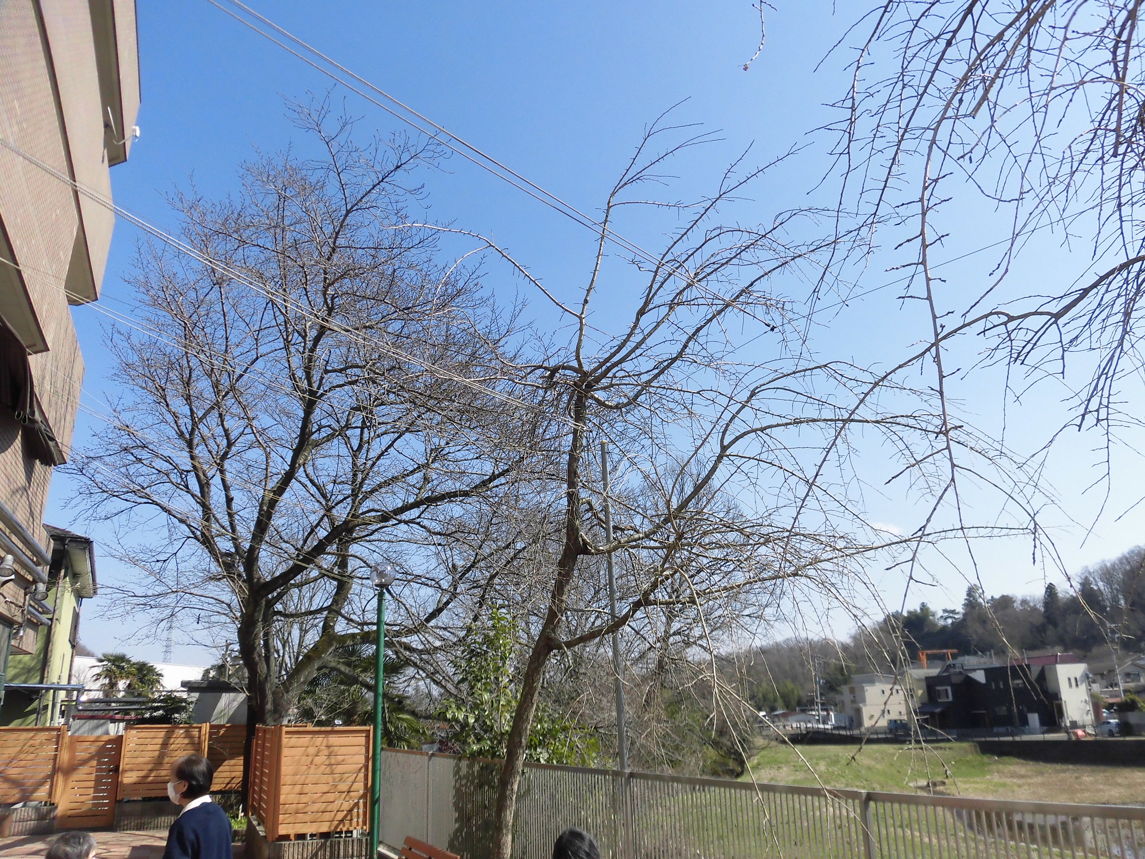 「桜の芽はもう膨らんだかな?」皆でテラスに出てみました。