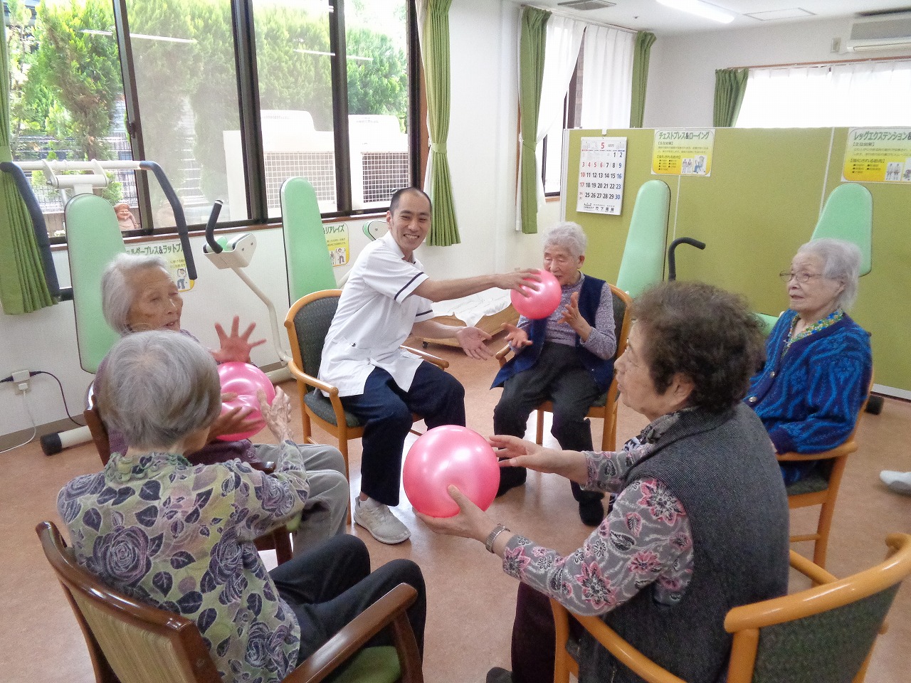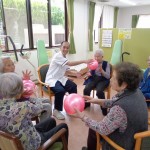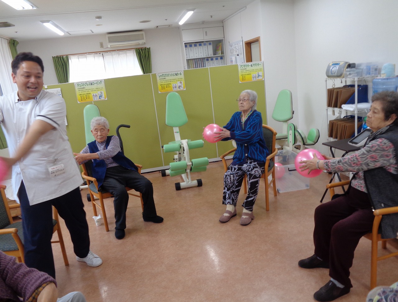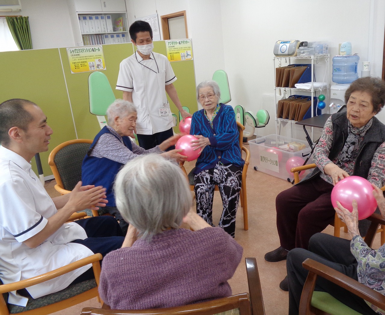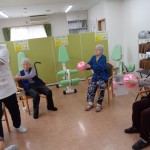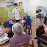 『あんたがたどこさ』の歌に合わせて、“さ“で隣の方にボールを渡す運動も行いました。