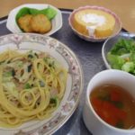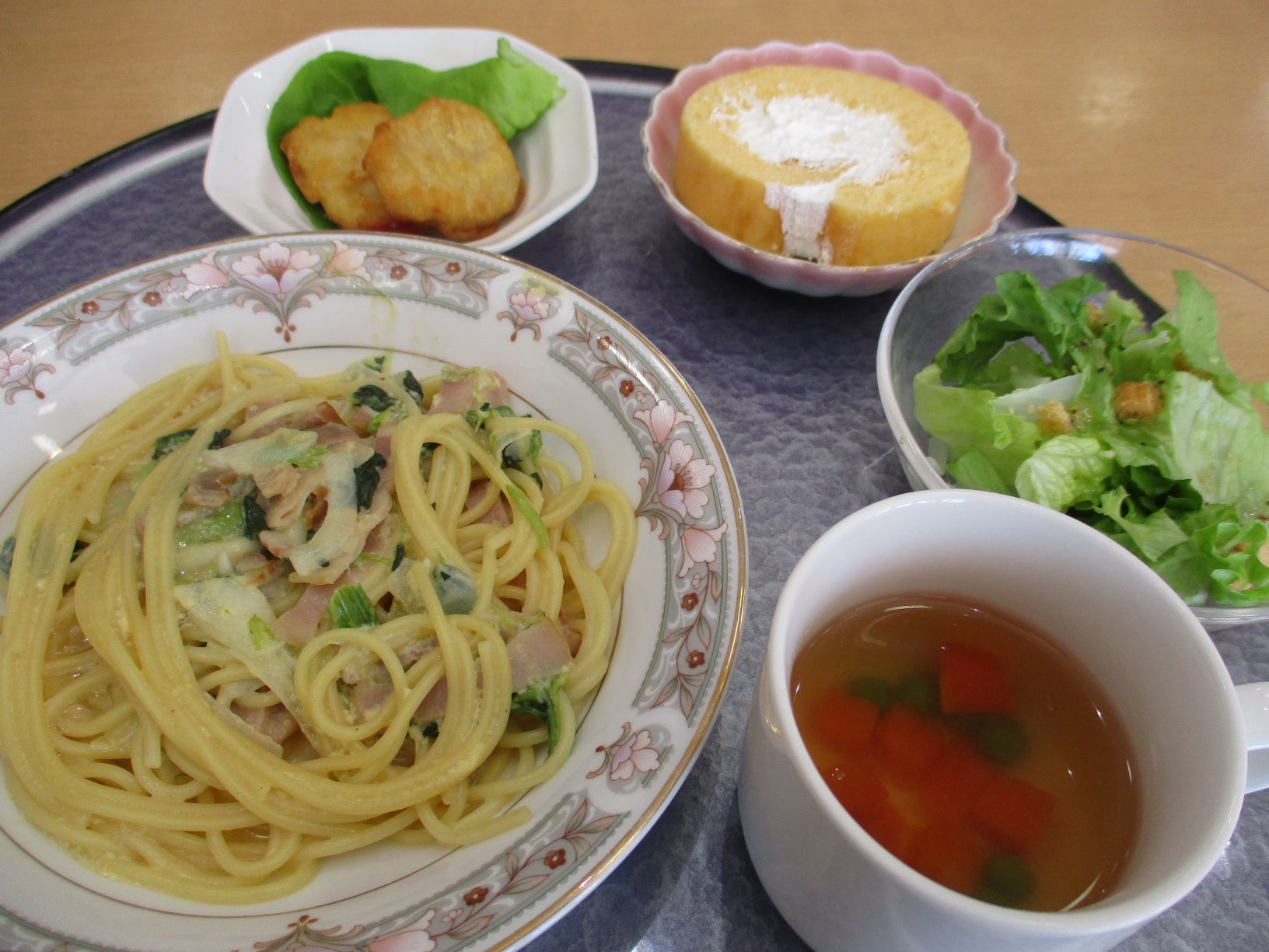お昼にホワイトデーランチを提供。「カルボナーラ」「ロールケーキ」等々を召し上がり、
