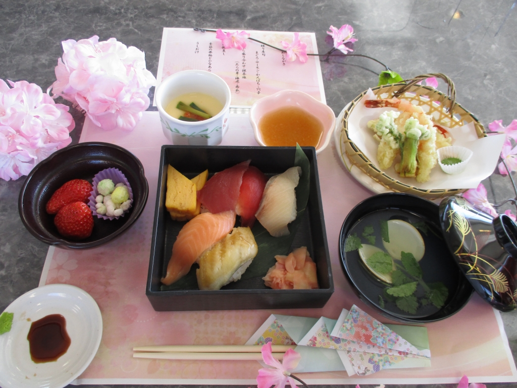 昼食には、皆さんお好きな「にぎり寿司」です。天ぷらに、茶碗蒸し皆さん笑顔で「美味しい」と召し上がって頂きました。
