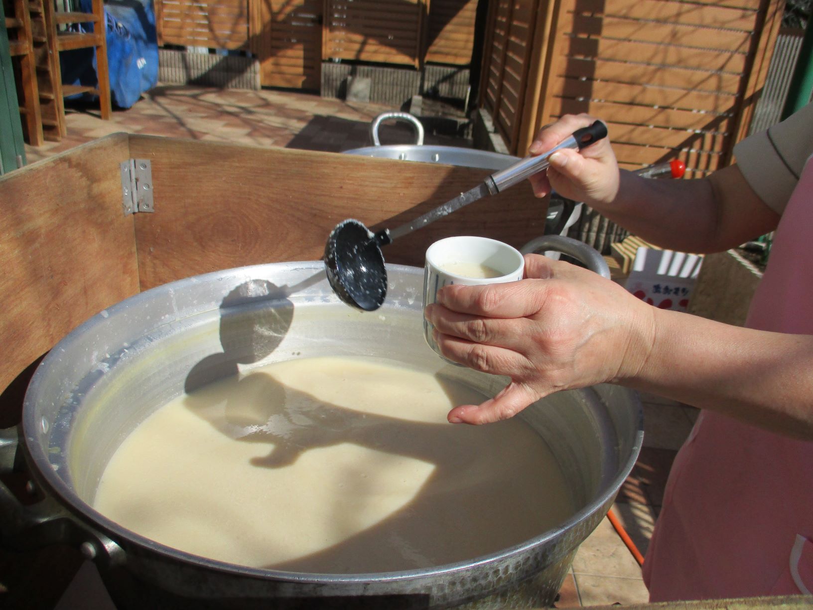 テラスに出て「甘酒」を作って召し上がって頂きました。