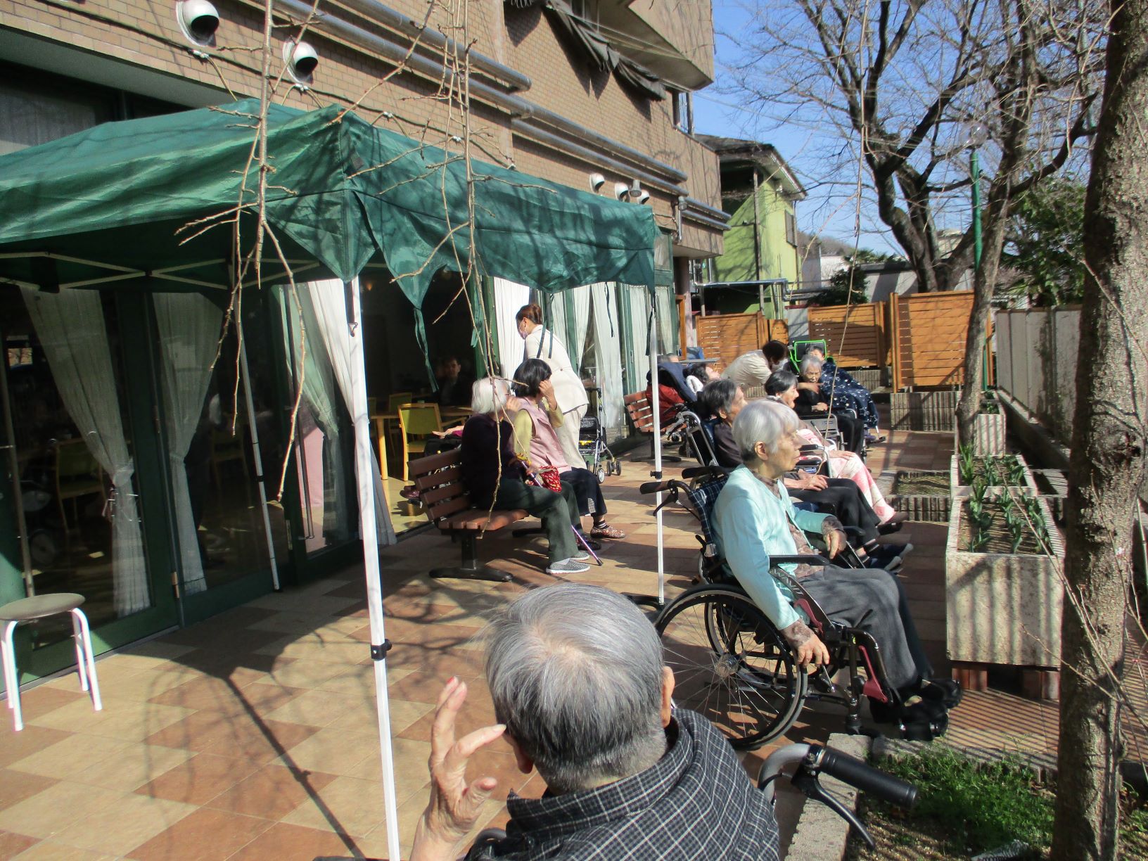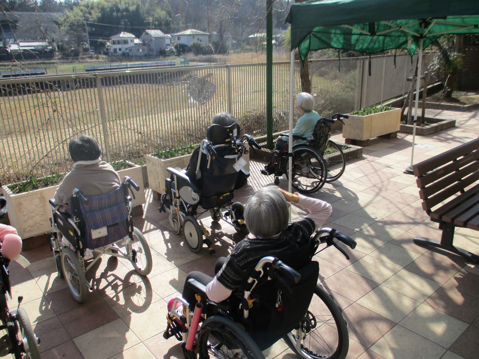 本日は、午後の暖かい時間にテラスに出て日向ぼっこの会を開催致しました。