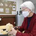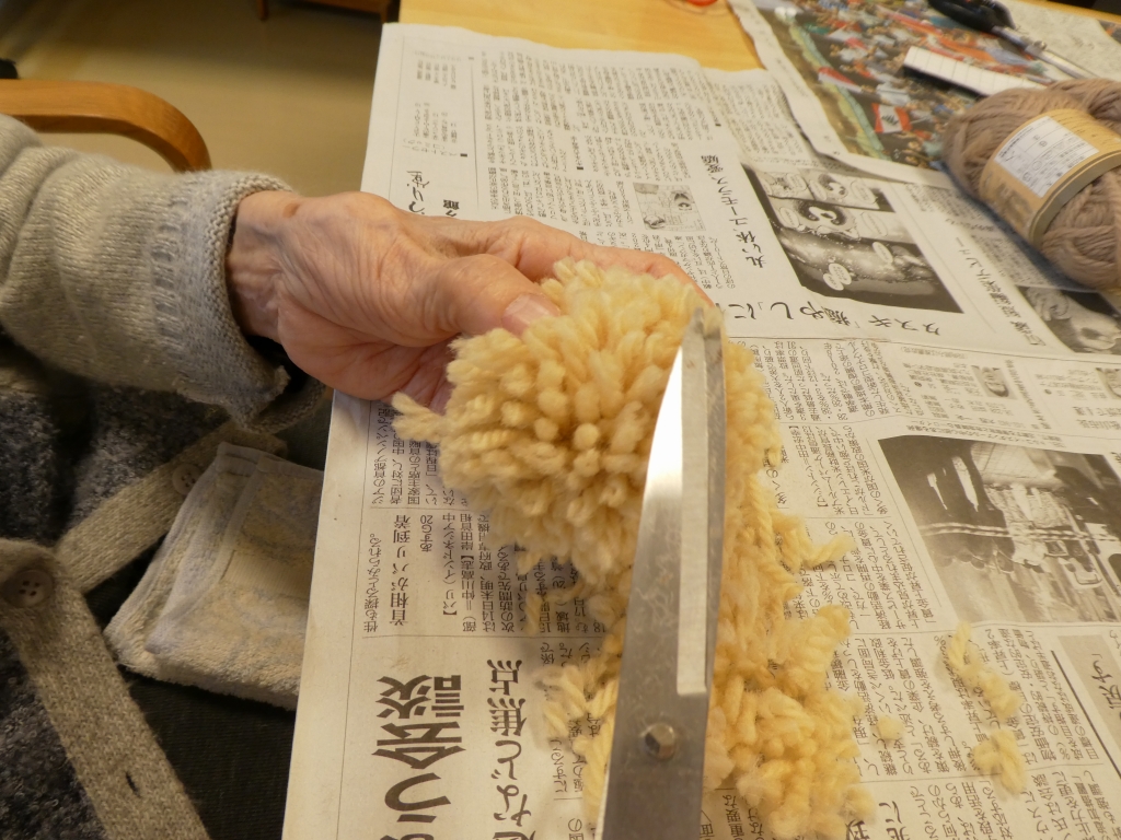 巻いた毛糸を中心でしばり、輪をハサミで切ったら