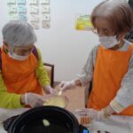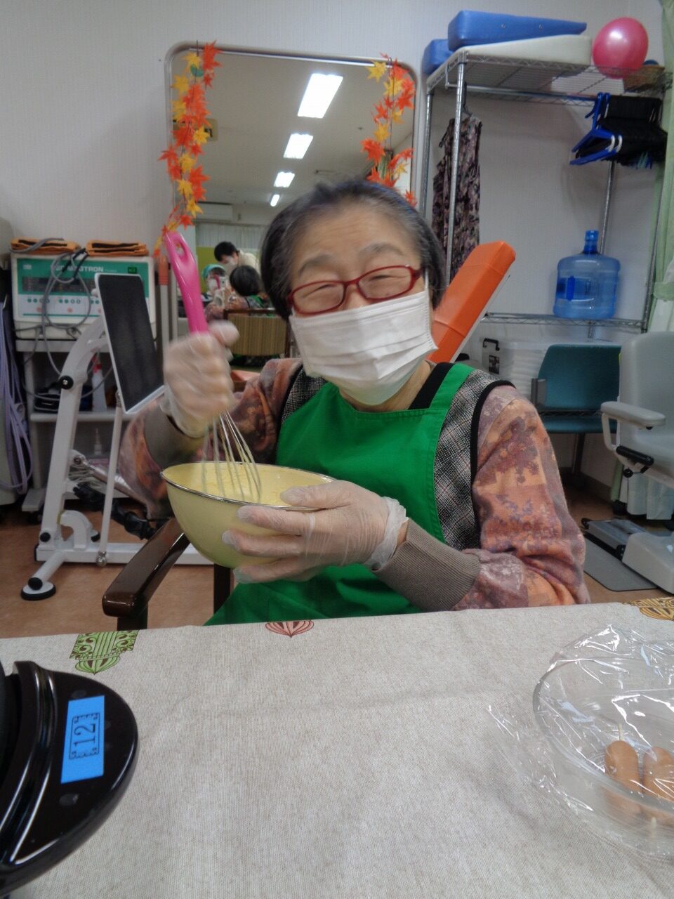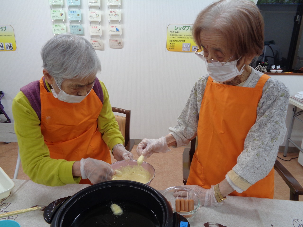 本日は手作りおやつクラブを行いました。メニューは「ミニアメリカンドック」です!ホットケーキミックスの粉に豆腐、牛乳、卵を入れてしっかり混ぜます。爪楊枝に刺したウィンナーやバナナを生地に絡めて油で揚げます。きつね色になったら完成です♪
