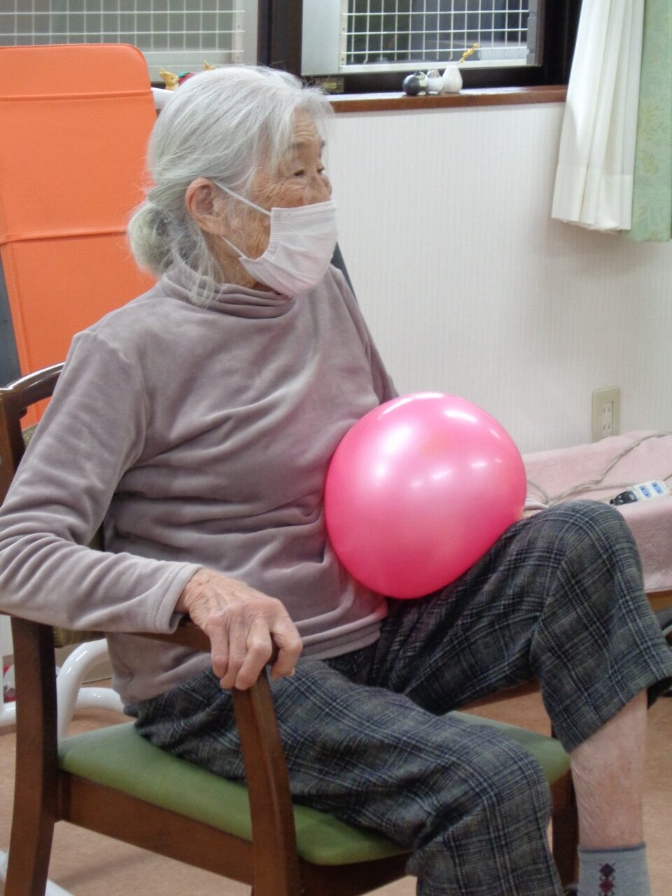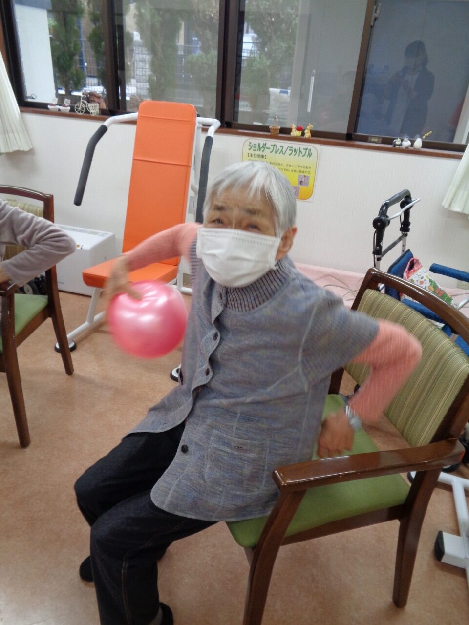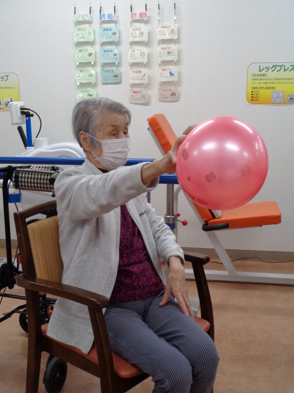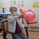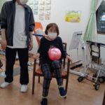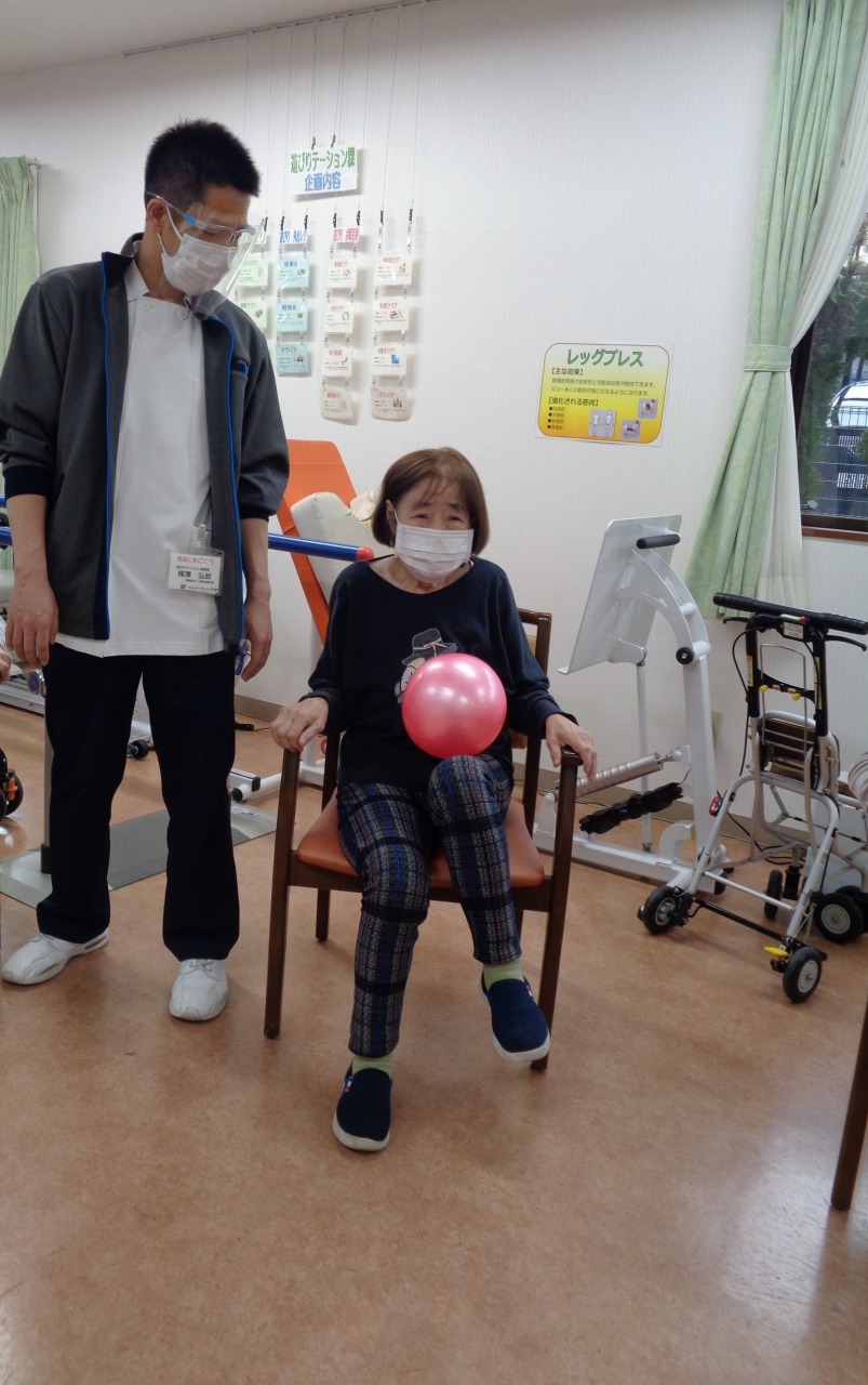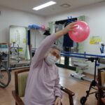 本日は日野リハビリ室にて運動クラブを開催し、ボールを使った上下肢の運動を行いました。今回は偶然ですが、ご参加いただいた方、全員女性!皆様、掴む、伸ばす、回す、投げる等、様々な動作をパワフルにこなして下さいました。初参加という方もいらっしゃいましたが、たくさんの笑顔が見え、楽しんで下さっているようでとても嬉しく思いました。