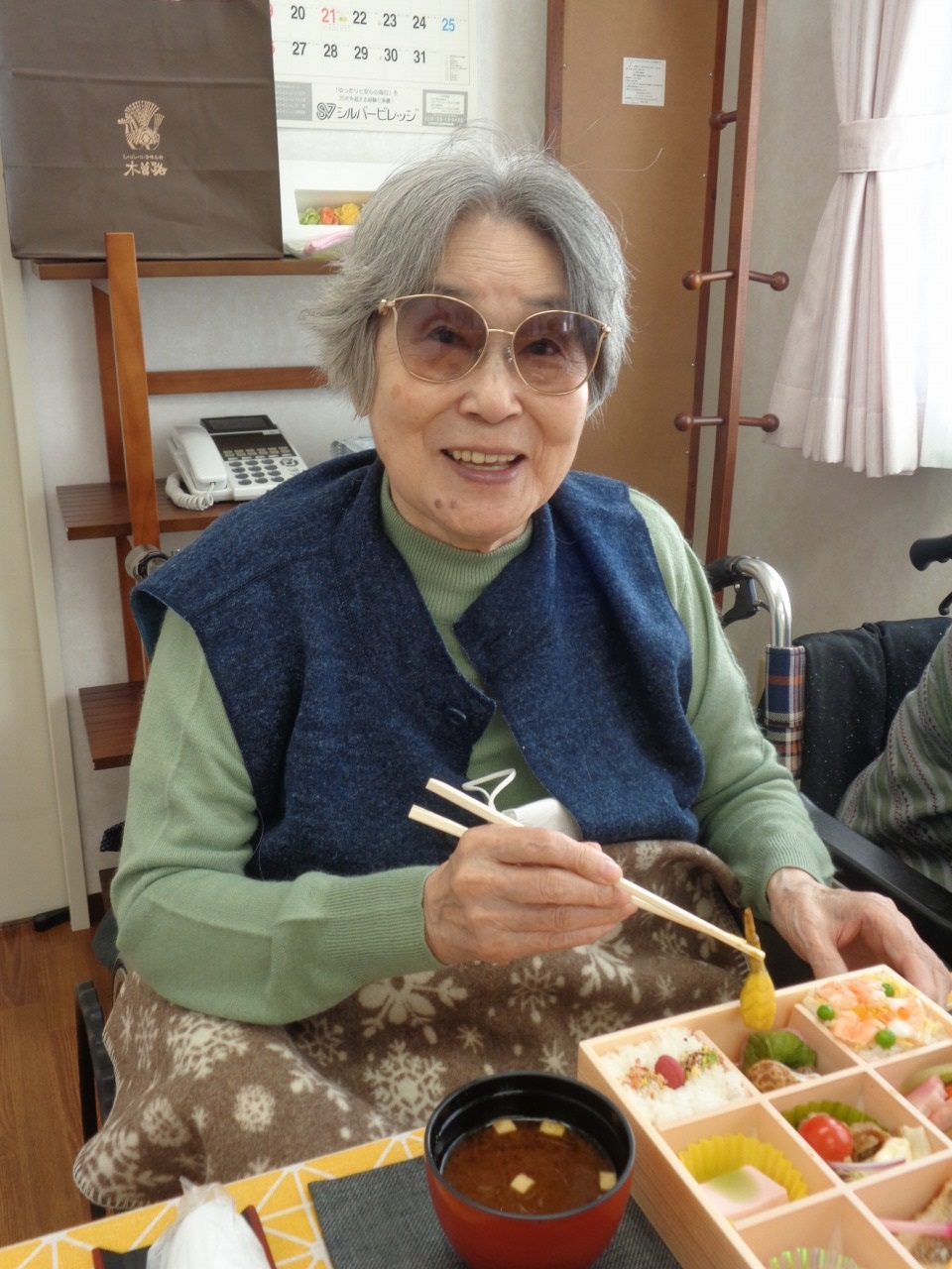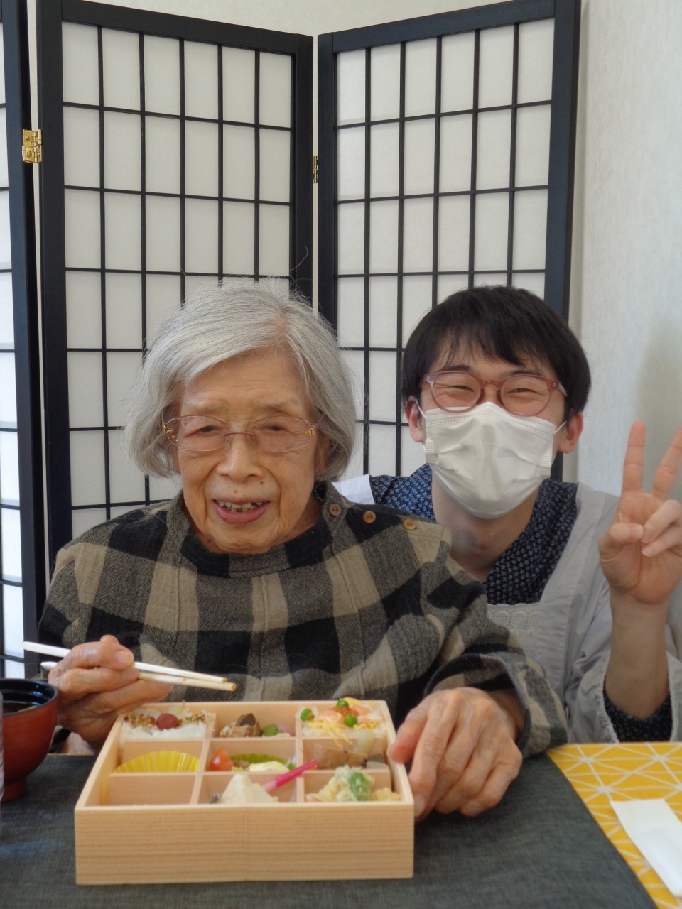 良いお天気の中、窓の外の河津桜を眺めながらお弁当を食べるという最高のシチュエーションとなりました。