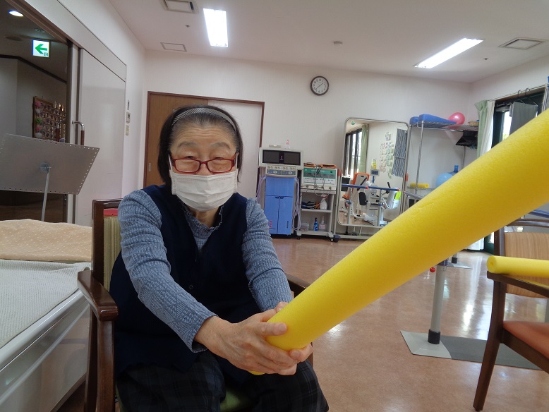本日は日野リハビリ室にて運動クラブを開催し、棒体操を行い、お身体全体を大きく動かしていただきました。皆様、抜群のチームワークで、お互いに声を掛けながら運動をして下さり、助かりました。