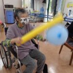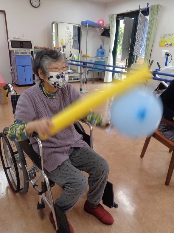 風船を床に落とさないように棒で叩くゲームでは、身を乗り出す方もいて活気のある運動クラブになりました。