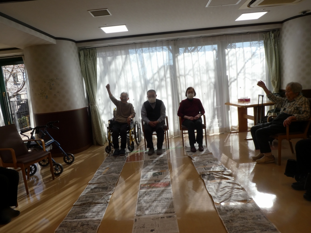本日のゲームは、長く繋げた新聞を足で手繰り寄せる『新聞足漕ぎゲーム』です。