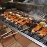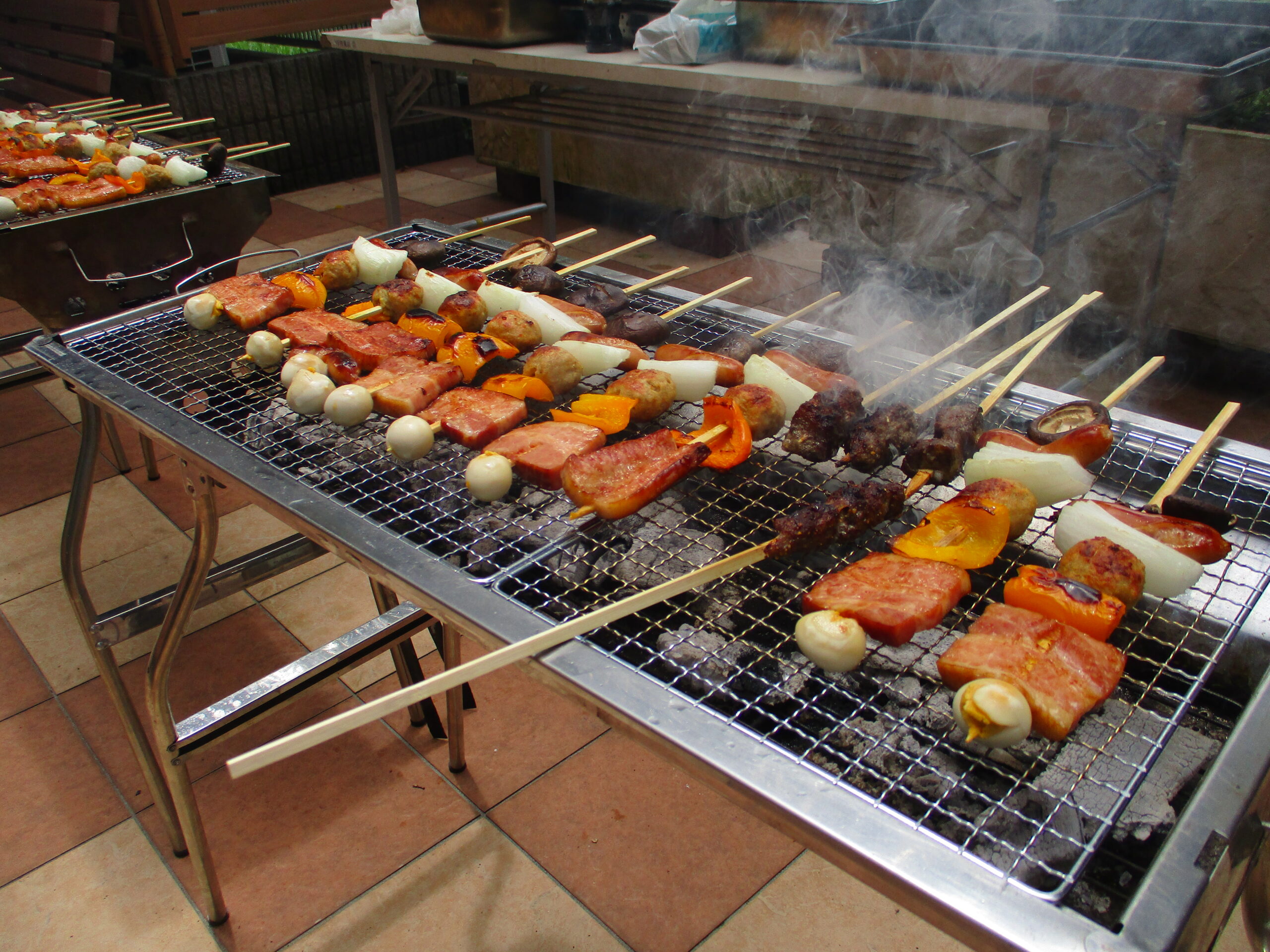 長い串に、お肉やお野菜、ソーセージなどたくさんの種類の食材が刺さっており、焼き上がりに感動の声が上がっておりました。