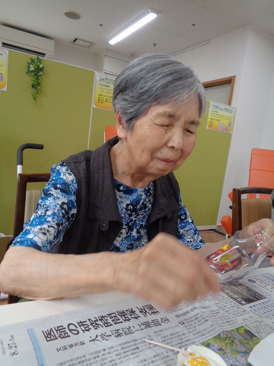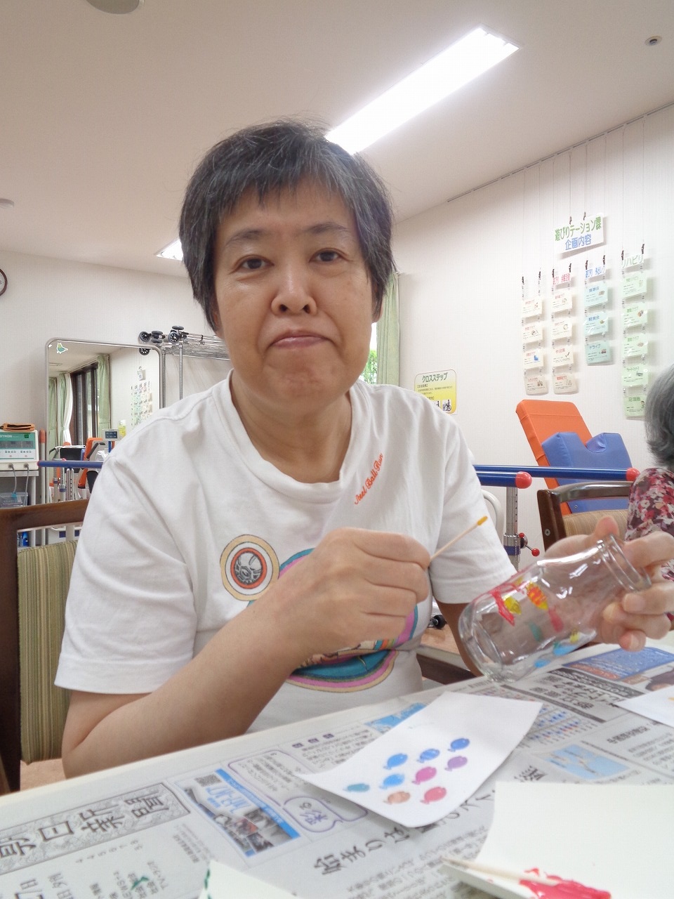 8月28日(水)、本日の手作りクラブは「牛乳ビンのペイント」を行ないました!ガラスペイントという塗料を使いました。透明感のある塗料で、乾くと少し膨らみ、ステンドグラスの様になります。皆様お好きなデザインを瓶に描いてくださいました。お部屋に飾っていただければと思います。