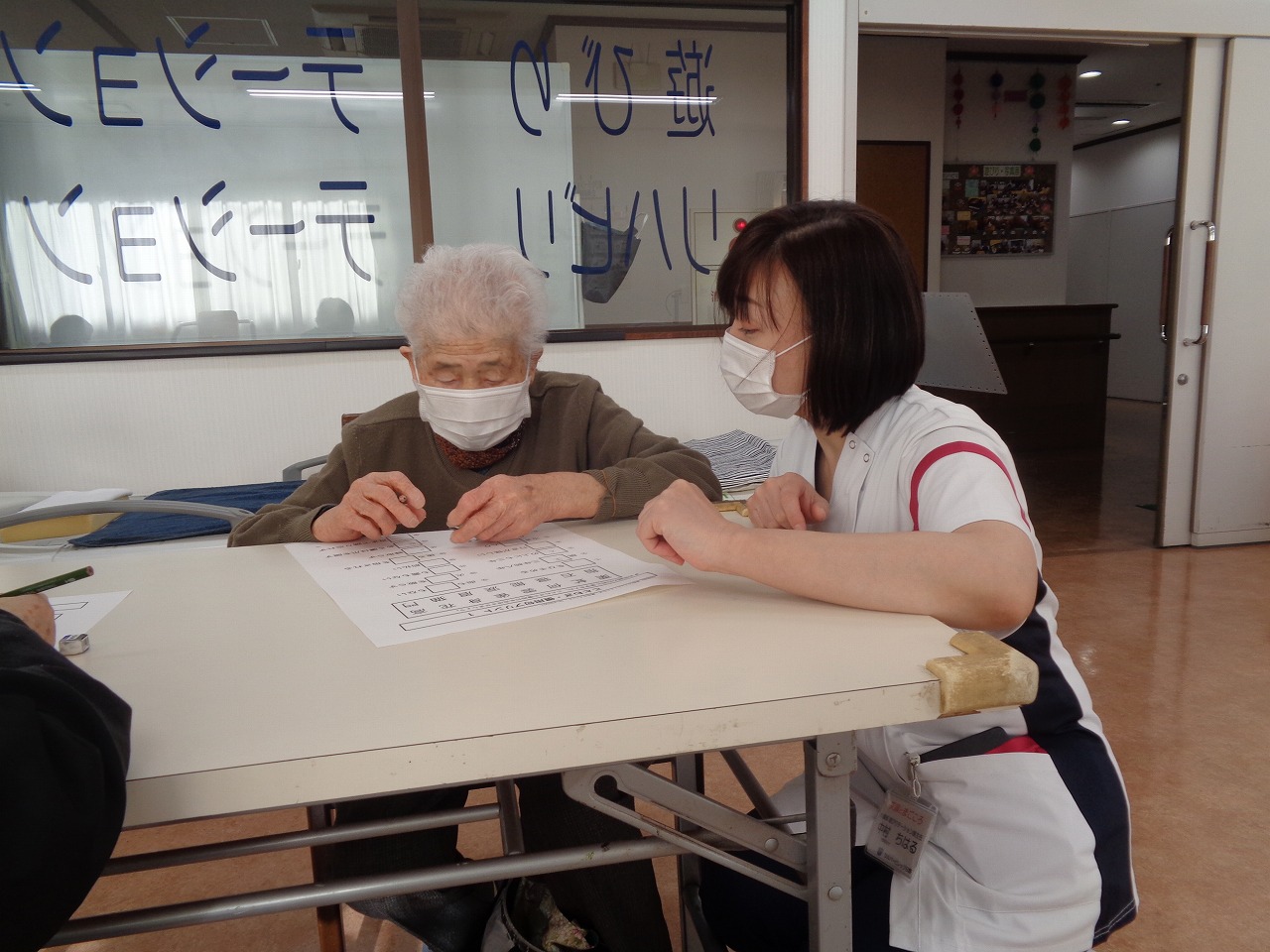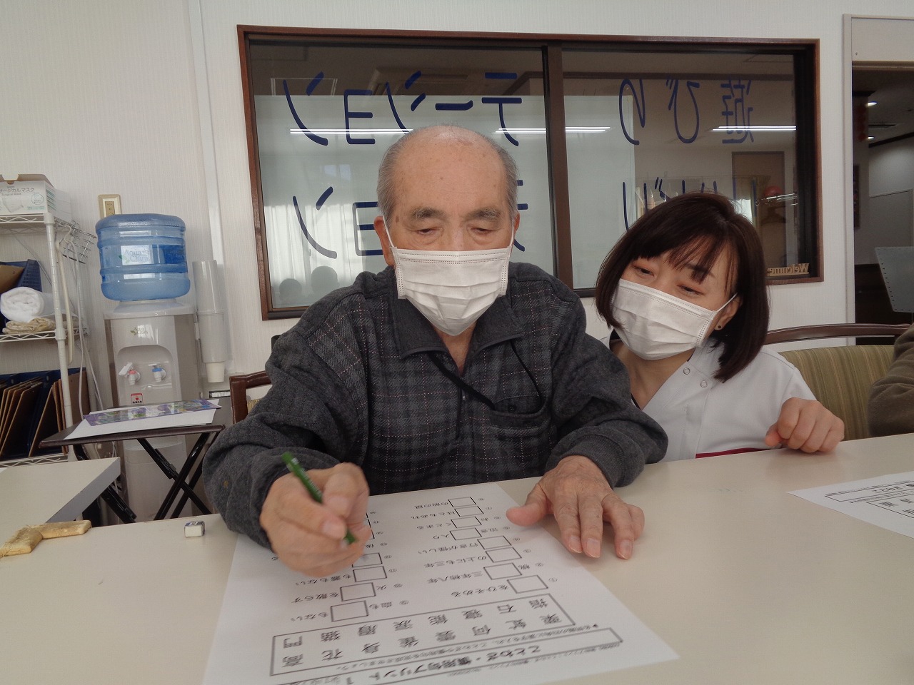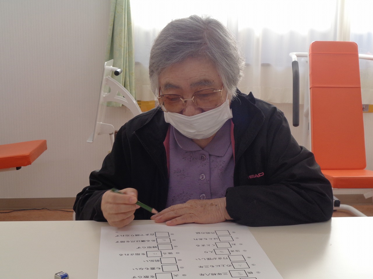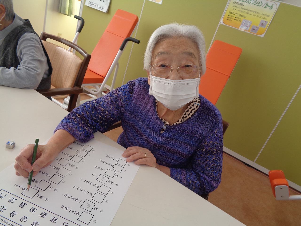 本日は日野リハビリ室にて学習クラブを開催しました。今回は( )より団子、目の( )を変える、等のことわざや慣用句の空欄を埋めるクイズに挑戦していただきました。皆様、「うーんなんだっけなぁ」「こっちは当たっていると思うのだけど!」と頭をひねりながら考えて下さいました。答え合わせが始まると、元気よくそれぞれの解答を教えて下さり、最後まで盛り上がりました!