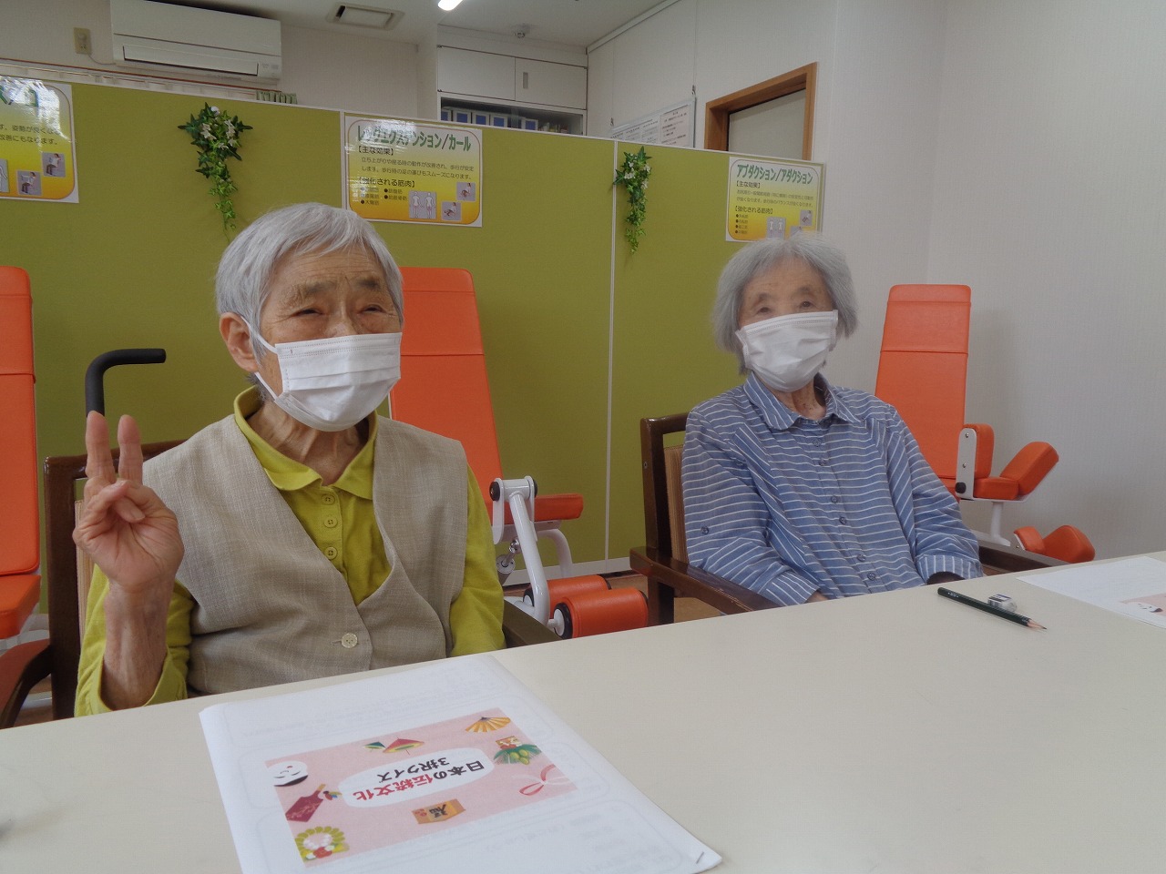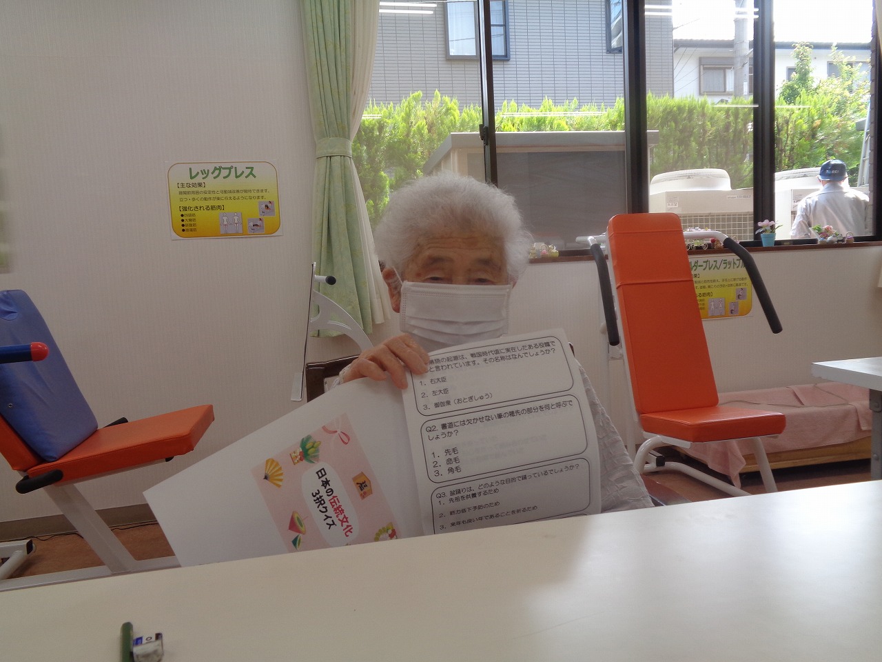 本日は日野リハビリ室にて学習クラブを開催!今回は、日本の伝統三択クイズに挑戦していただきました。盆踊りの本来の目的や、水戸黄門で有名な印籠の正しい用途など、様々な問題がありました。
