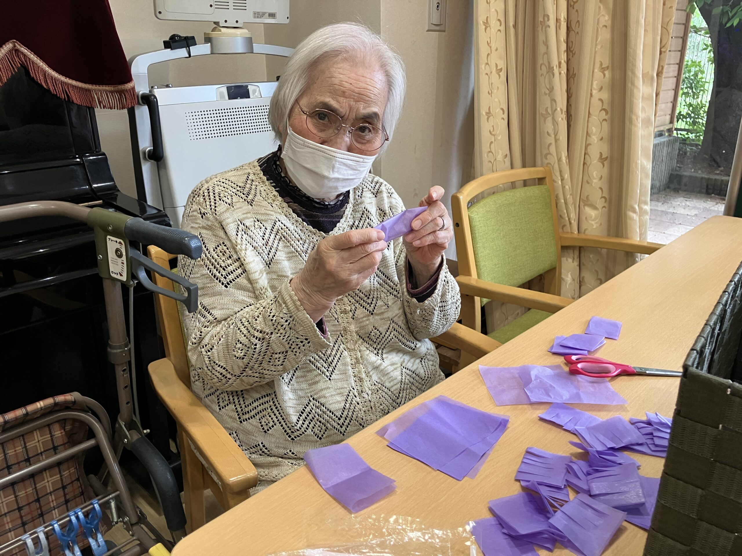 ラベンダーの枝の部分は竹串に緑色の折り紙を巻き付け、お花の部分はお花紙に切り込みを入れ枝に張り付けていきます!!