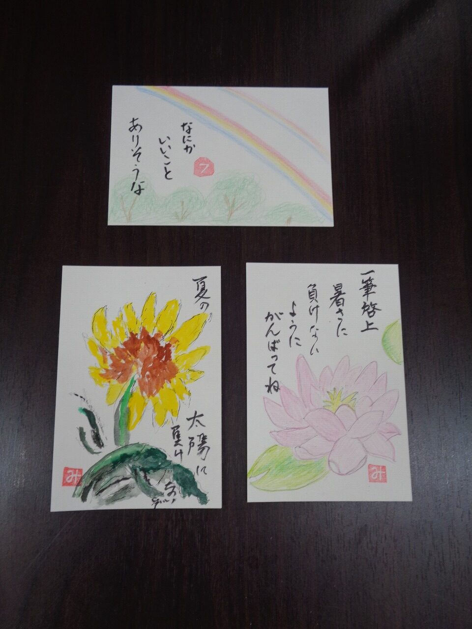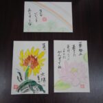 「これを描こうと思うの」と先日の雨上がりに現れた虹の写真を見せてくださいました。二重に架かった虹の写真を見ながら、人生初の絵手紙を描いてくださいました!とても可愛い絵手紙が完成しました♪
