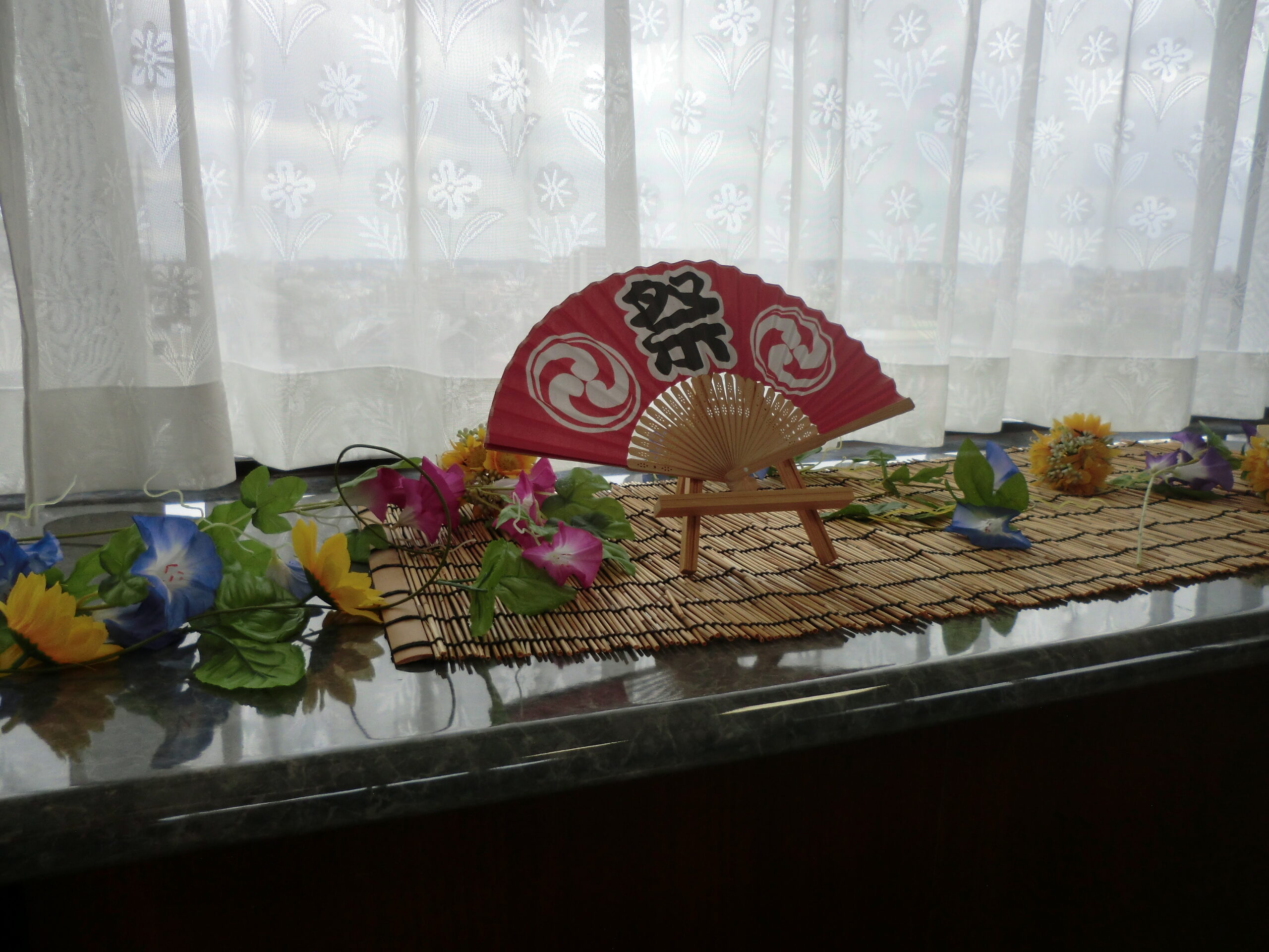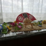 テーブルに折り紙で作った鶴と亀、野点傘を飾り、