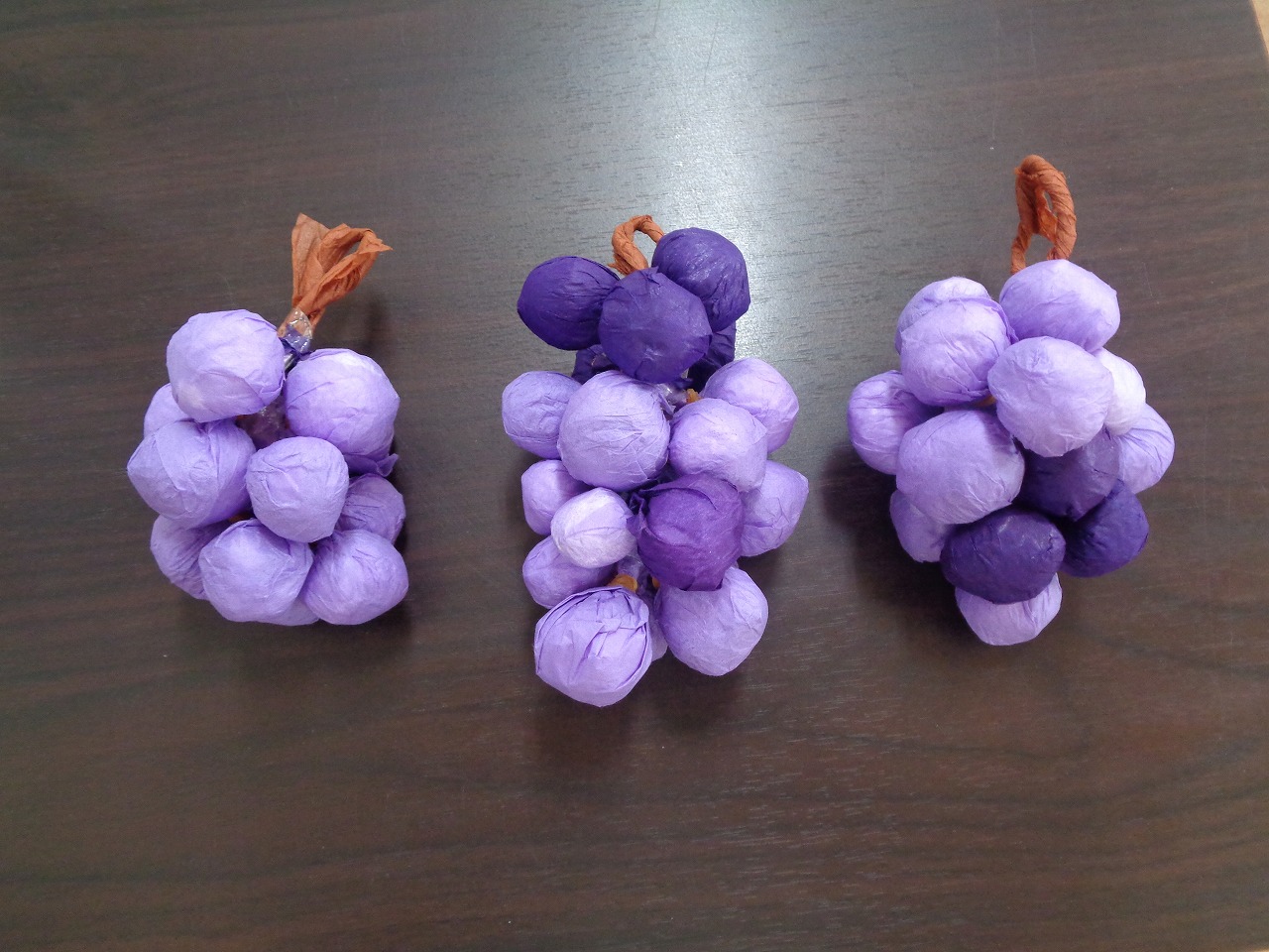 を作りました!前回作ったぶどうの実を、ぶどうの枝に付けていき、たわわに実ったぶどうの完成です!「このぶどうは高級品ね!」「私のぶどうは安いわよ」等々、笑い声溢れるクラブの時間でした♪
