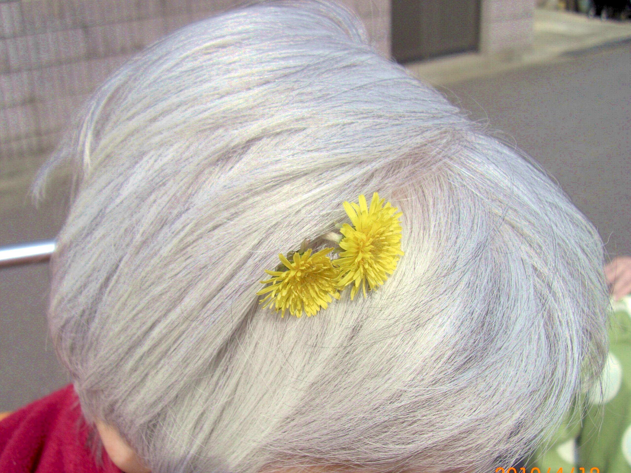 2010.04.20 シルバービレッジ日野東館 ヘッドドレスはたんぽぽで! シルバービレッジ日野東館の玄関にはパンジーとビオラがきれいに咲いていますよ! おとといは寒く季節はずれの雪も降りましたね。びっくりです。 今日は太陽も元気良く出てくれ、お散歩に行って来ました。 たんぽぽが咲いていたので髪飾りにしてみました。 かわいいでしょ? Writer:鈴木 祐佳