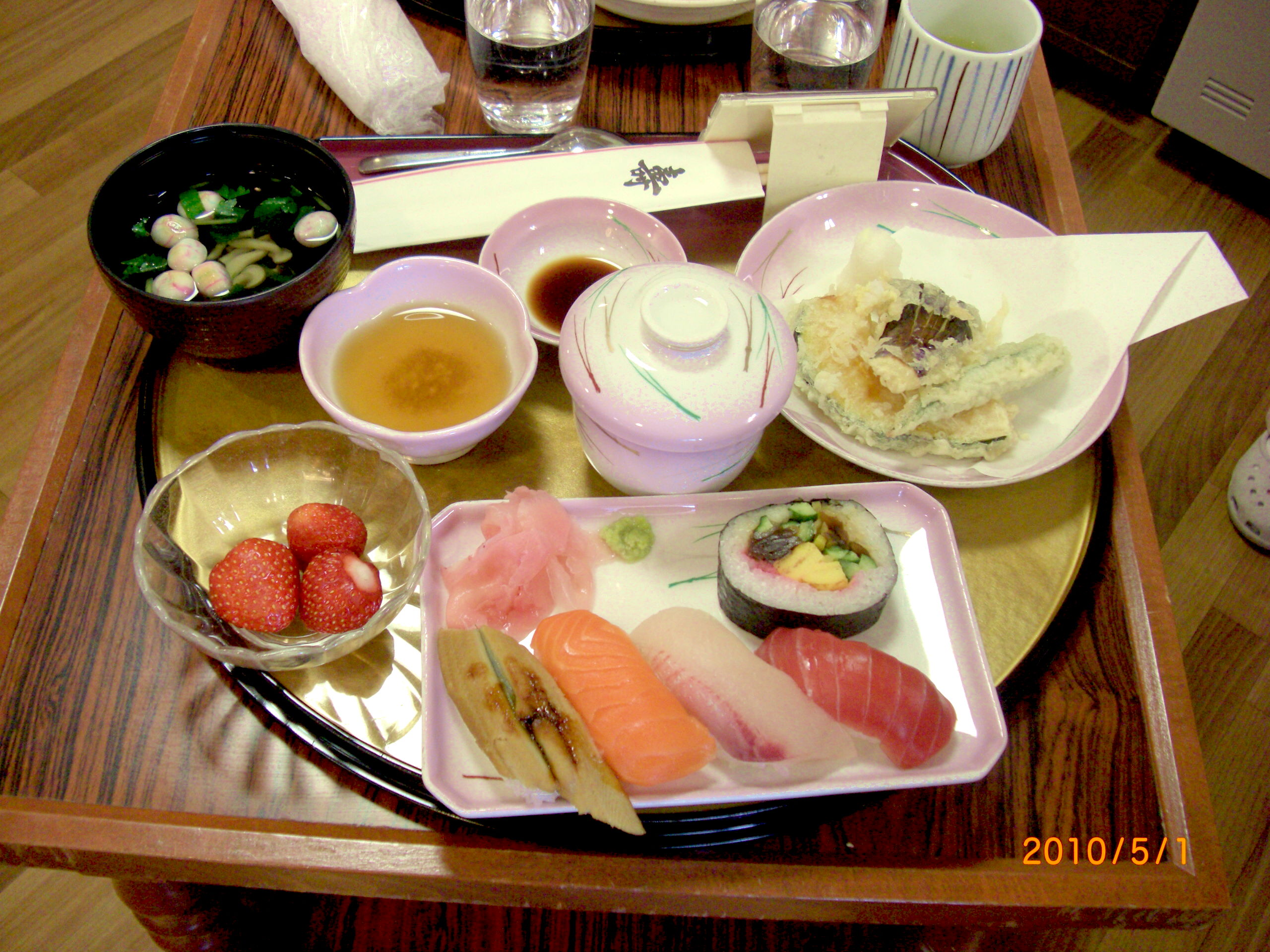 握り寿司(おかわり自由!)と揚げたての天ぷら、茶碗蒸し等で