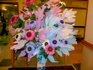 2010.06.21 シルバービレッジ中央・別館 夏らしく! 玄関前のオーナメントも変えました! 今回は、原色のひまわりと、その下には、 海のイメージで、ガラスに貝殻とか入っています。 お寄りの際には、確認してみてください。 Writer:高水 直人