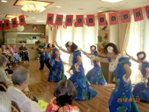 途中、職員も飛び入り参加になり始めてのフラダンスをホクラニの皆さんと