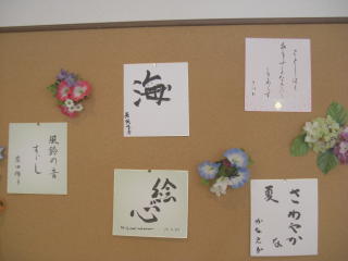 2011.07.27 シルバービレッジ日野東館 今月の書道教室は 今月の書道教室は・・・ 半紙ではなく色紙に 筆をすべらせました。 書く物を変えると 趣きが少し変わりますね! 海という字をご覧下さい。 波の流れが表現されているような 字に見えませんか? Writer:鈴木 祐佳