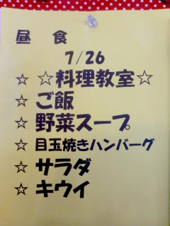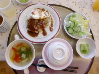 2011.07.27 シルバービレッジ日野 手作りハンバーグ 本日7月26日は料理教室の日です。 メニューは 目玉焼きハンバーグ 野菜スープ サラダ キウイ ご飯 上手に焼けた目玉焼きと 館内に広がるハンバーグ の焼ける香ばしい臭いが 私のお腹を刺激します。 美味しいそうに出来上がりました。 早く食べたーい! いただきまーす!! Writer:藤井 智宏