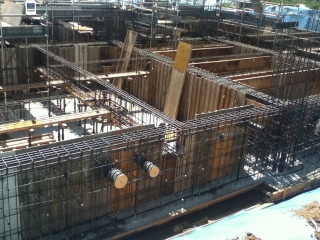 鉄筋宏次が終わるとコンクリートを流すための型枠を鉄筋に沿って作ります。