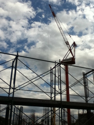 秋空にそびえるタワークレーン、勇ましい光景です。
