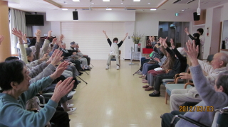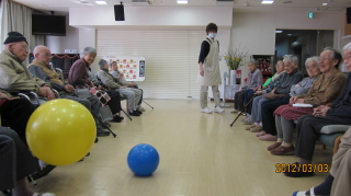 2012.03.03 シルバービレッジ西東京 介護予防の日 毎月第一土曜日は、介護予防の日です。 体重測定の後 下肢の筋力をつける為 バランスボールを使って足で蹴る運動をしました。 「はい!それー!こっちだ!」大小2個のボールを使用し 瞬発力を養いました。手は、リハビリ体操「1,2,3...」 その他にもぐらたたきゲームなども楽しみ 活気にあふれた春の1日でした。 Writer:宍戸 房子