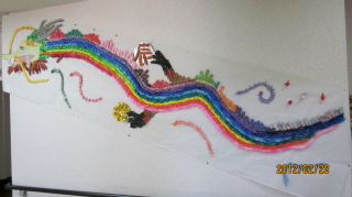 2012.03.01 シルバービレッジ西東京 龍 創作レクリェ―ションで、大きな龍を作りました。 これは、昨年から入居者の皆様が折り紙でたくさんの 折鶴を作ってくださいました。 それを利用して今年の干支をつくりました。 2階の廊下の壁に龍の勢い舞っています。 龍が往くがごとく 私たちも頑張っていきます。 Writer:岩崎みつ子・高水美江