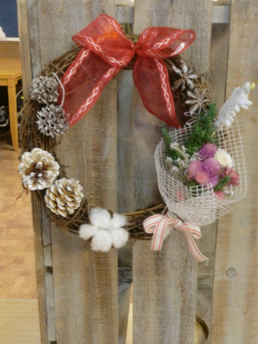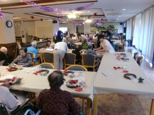 2012.12.18 シルバービレッジ日野 12月6日(木)『フラワーアレンジメント』 午後のレクリエーション 「フラワーアレンジメント」 今回はクリスマスのリース作りです。 先生の説明に、各々作り始め。。。 本体にパーツを付けていきます! 針金で巻いたり、接着剤でくっつけたり! 入居者も職員も、楽しみながら作っていました。 入居者に負けじと、職員が必死だった事は言うまでもありません! 皆様の個性が出て、素晴らしい作品が出来ました! できあがった作品は、皆様の居室のドアに飾られています! Writer: 渡辺 豊