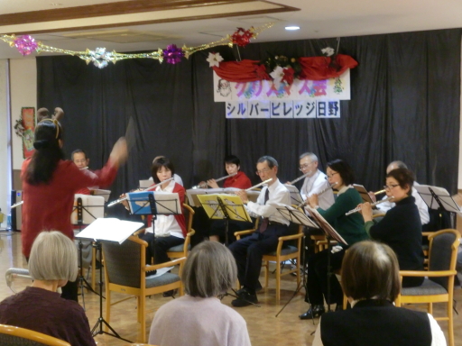 2013.01.03 シルバービレッジ日野 クリスマス会♪ 12月18日(火)にシルバービレッジ日野ではクリスマス会を開催。 午前中は、八塚先生のピアノの伴奏に合わせて職員が合唱・合奏を披露。 この日に向け、職員は猛練習?をしてきましたが・・・。入居者の皆様方から 大きな拍手を頂く事ができました。(笑)昼食はクリスマススペシャルメニューを 楽しんで頂きました。午後は、入居者のご家族様も在籍する国立フルートアンサンブル の皆様の素敵な演奏で1日、クリスマス気分を味わって頂けました。 ご協力頂いた皆様、ありがとうございました。 Writer: 奥本 隆