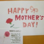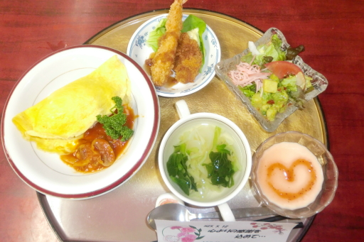 5/12 母の日ということで、オムライスにエビフライ、ハートのプリンなどが昼食にでました(*^_^*)