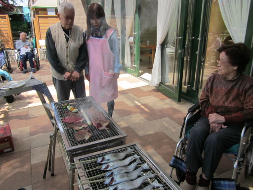 肉は柔らかく焼け具合も丁度よく好評でした。野菜は玉ねぎ、カボチャ、ピーマン、椎茸を鉄の串に刺して提供しました。それと、ニジマスを提供し御入居者とても喜ばれていました。