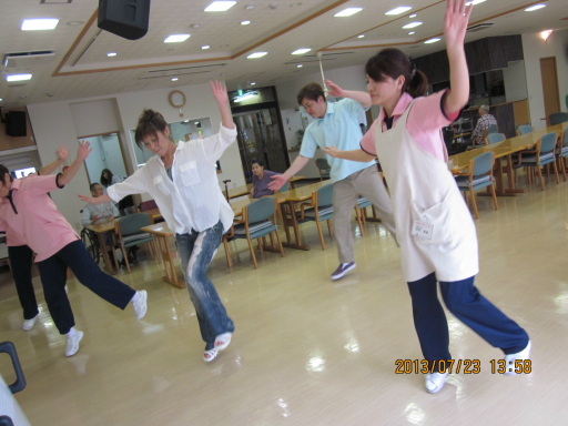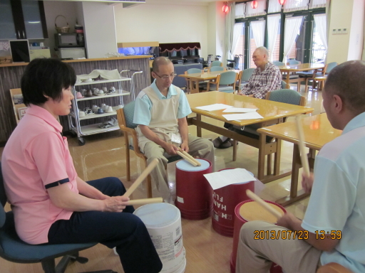 2013.07.24 シルバービレッジ八王子西 太鼓でドンドン・・ 太鼓が、「ドンドン!」「ヨッシャ ヨッシャ!」「ソイ ソイ ソイ ソイ!」昼休み1階ホールは、踊りのメンバーと太鼓のメンバーが 8月2日の納涼祭を目指して毎日練習に 汗を流しています。とてもにぎやかで 活気に溢れています。八王子西のお祭りをお楽しみに! 介護部 宍戸房子