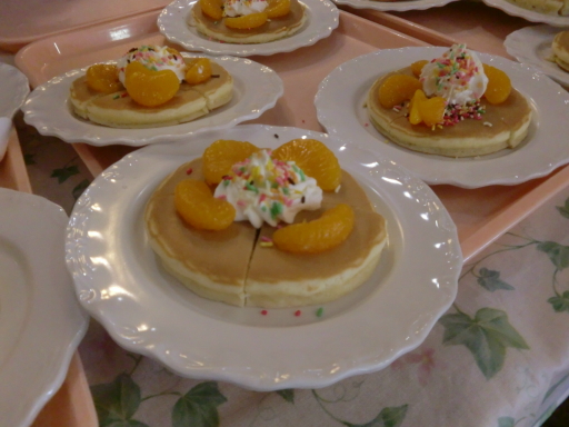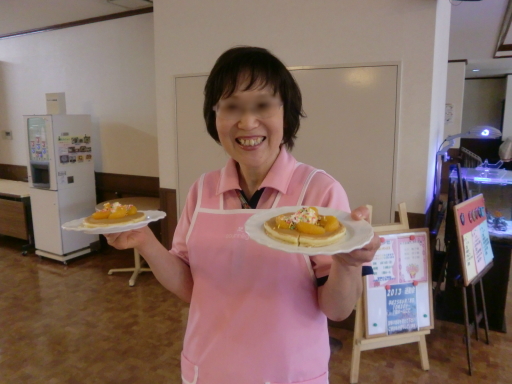 おやつはパンケーキ♪入居者様の中から数名と職員が、パンケーキにフルーツやホイップクリームをトッピングして、皆様に振る舞っていただきました。有名なエッ○○・シ○○スのパンケーキに負けない位のボリューム感でした!!