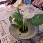 今回は、真っ白な“カラー”というお花と、大きな葉の“モンステラ”をいけました。